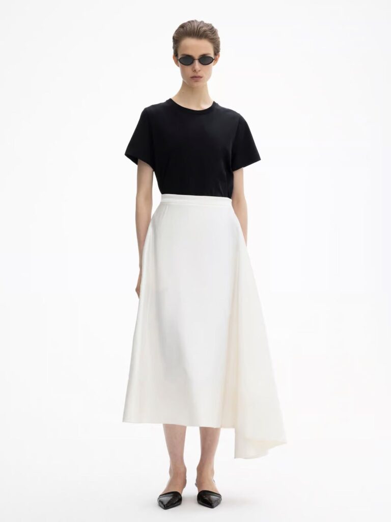 Asymmetrical midi skirt + cap-sleeve blouse + pointed flats.