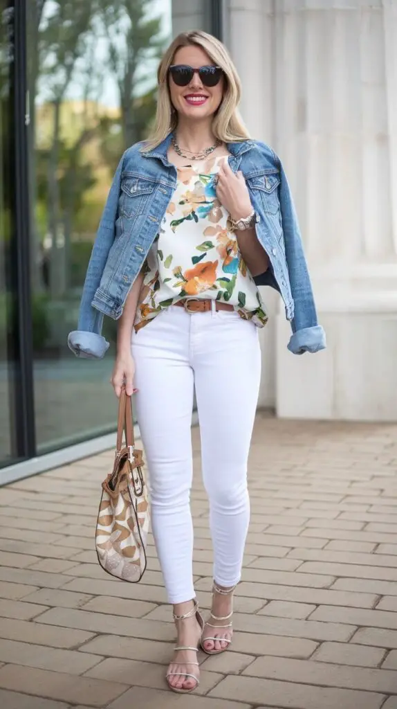 • Floral blouse + straight-leg jeans + denim jacket + slingback heels.