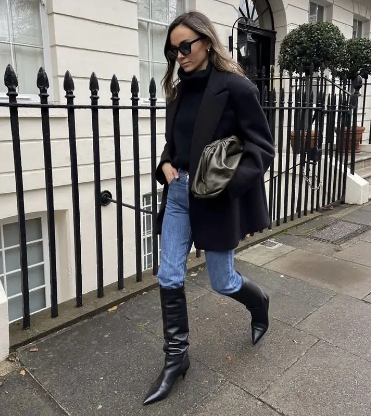 • Chunky knit + dark-wash jeans + knee-high boots + wool coat.