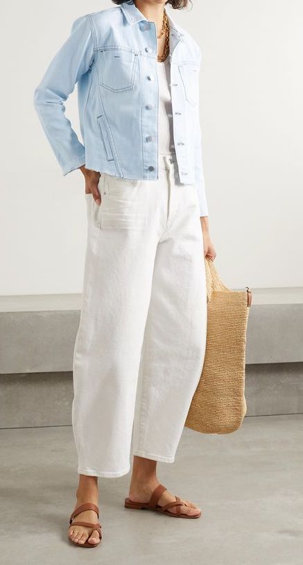 White linen trousers + cotton jacket + oversized straw tote.
