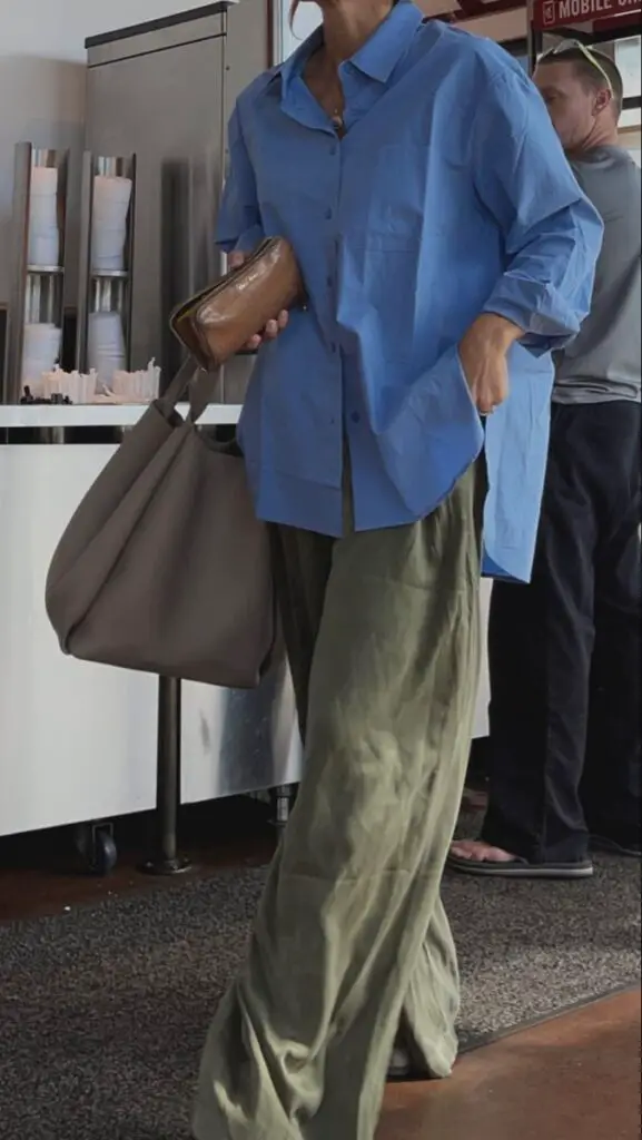 • Baby blue shirt knotted at the waist + straight-leg jeans + ballet flats.