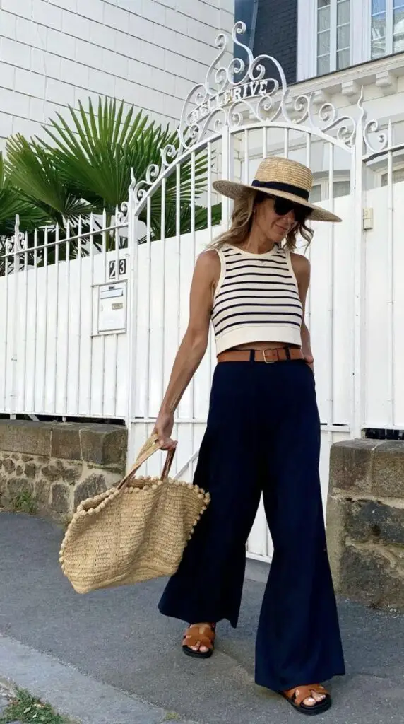• White cotton tee + wide-leg jeans + espadrilles + raffia tote.