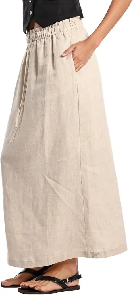 Even if the listing says “100% linen skirt,” double-check the care label in the photos or look for a clear breakdown in the description — for example, 100% linen, 80% linen + 20% cotton, or 55% linen + 45% lyocell.
